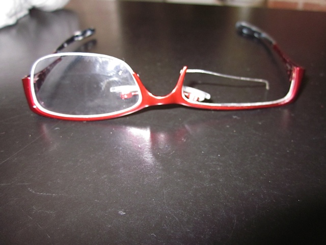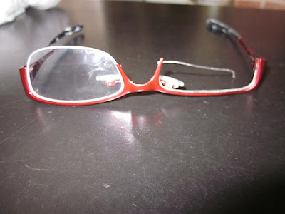 My work week had an interesting beginning on Tuesday. I will spare you the photo of my face and bruises, but here is what my glasses looked like after Emily cleaned off the blood and bits of skin and bent them from a twisted mess of metal to something reminiscent of a glasses shape. I'm pretty sure the nose pieces are not supposed to look like that and their position in this photo might explain the deep gashes in my face.