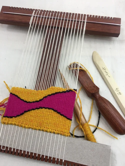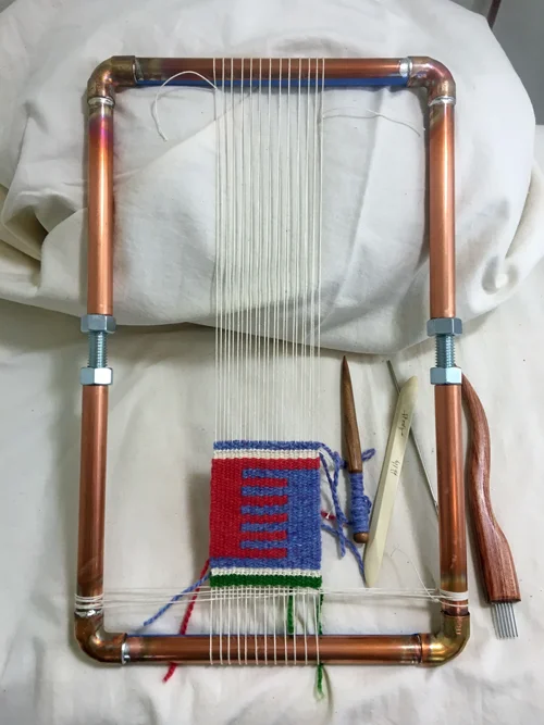 Last week I did this sample for the Weaving Tapestry on Little Looms online class. It was a test run for the new pipe loom as well as a demo for the new class. It is about three inches square at 8 epi. I was so pleased with this little pipe loom. It is solid and just the right size for a lap. I predict it and it's soon-to-be-made friends will get a lot of use.