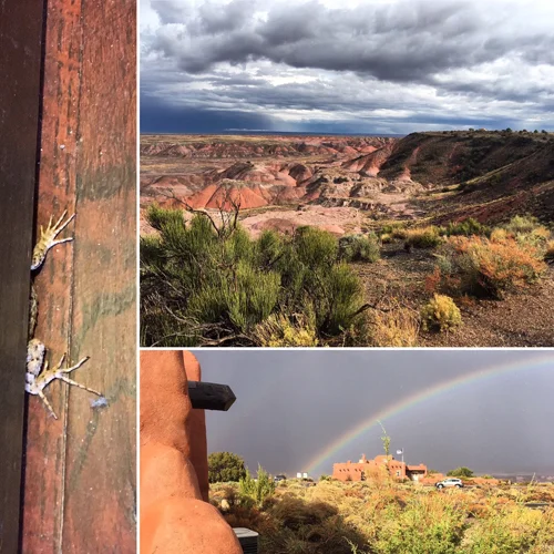 Saturday morning: I am here! What an amazing place. I was here as a kid, but my memory was of the petrified logs, not of the amazing desert landscape. I arrived in a driving rainstorm yesterday. It rained all the way from Gallup and I watched the arroyos start to run over those 70 miles. First trickles, then red streams, then raging brown rivers.