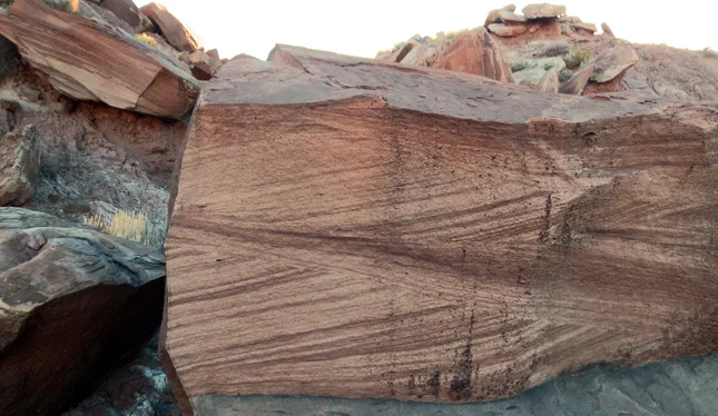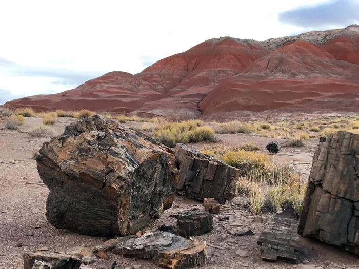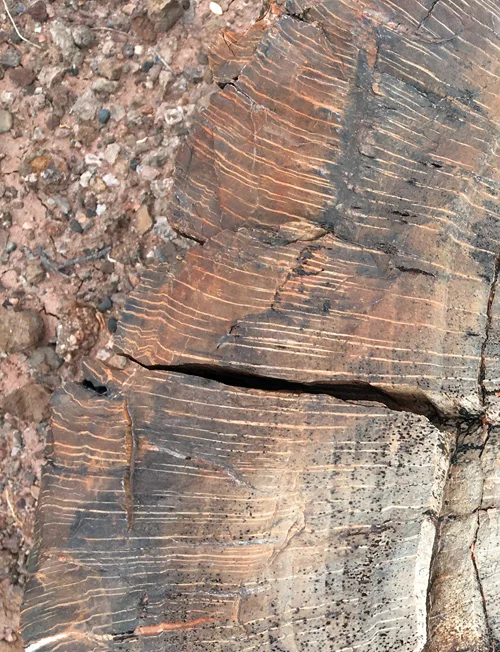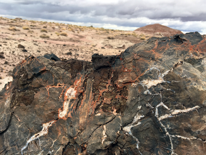 Day #17. The petrified wood over the length of the park varies in composition depending on the minerals in it. In the northern part of the park, the petrified wood is called the "Black Forest" and indeed, the wood is very dark. I spent a long time this afternoon looking at the various pieces of wood on the way to an archaeological site and marveling at the subtle color differences and these incredible lines.