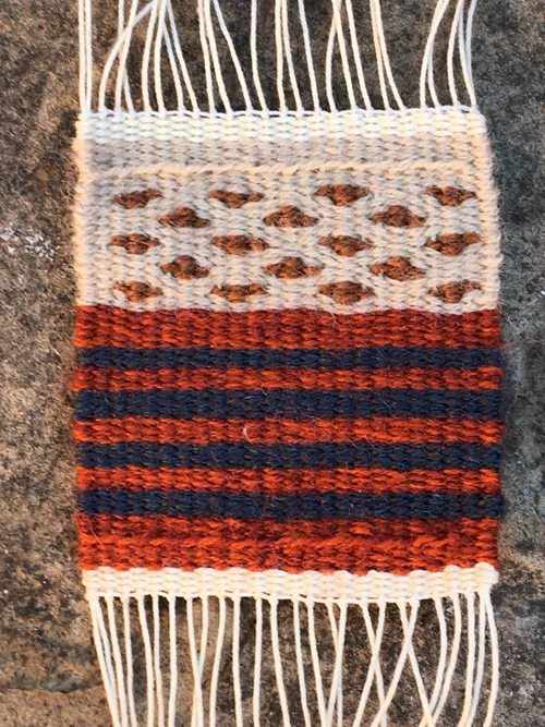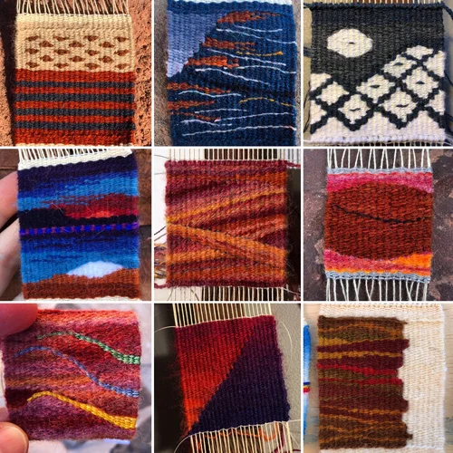 Day #18. This day I went hiking with another artist-in-residence who is overlapping me and her husband. We went back to a site I had visited before to find more petroglyphs. After we'd spent a long time climbing over boulders looking for glyphs, Shaun mentioned that he'd like to climb up to the top of the mesa to get a view. We did and sat down for a little lunch. We started looking around a bit and noticed a cairn and some rebar posts which are used by scientists to mark GPS locations. A few seconds later we realized we were sitting on the edge of a major archeological site that was littered with potsherds and flakes as well as an unexcavated dwelling. I took many photos of the sherds and flakes and wove this little tapestry that night which is a combination of two different patterns seen on the sherds.