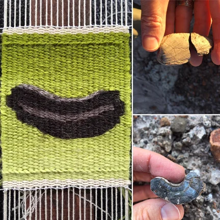 Day #21. There are fossils at Petrified Forest NP. Lots of them if you know where to look. I didn't, but then a ranger whispered about a little hill and some whole clam fossils eroding out of the bank. Found 'em! I know this looks a little like a pickle, or perhaps a hot dog, but it is the cross section of a fossilized clam. I just really wanted to use those greens that day. The photo top right is most of a whole, closed clam I found. The bottom right photo is the cross section which inspired the weaving.