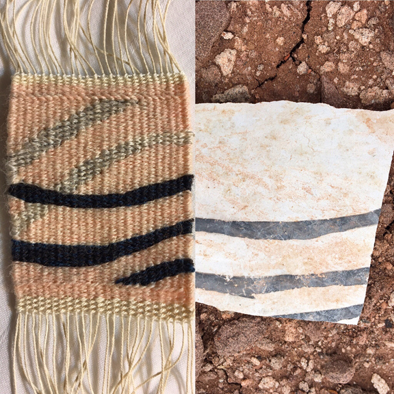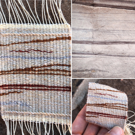 Day #22. John, one of the repeat volunteers, told me about some petroglyphs he had found the year before. It took me three times to find them. It turns out his directions were pretty far off, but once I found the panel, I couldn't believe I had missed it in earlier trips in this area. Later I found out they are called the Flatiron. While climbing around looking for more glyphs, I found more lovely layered rocks which inspired the days weaving.