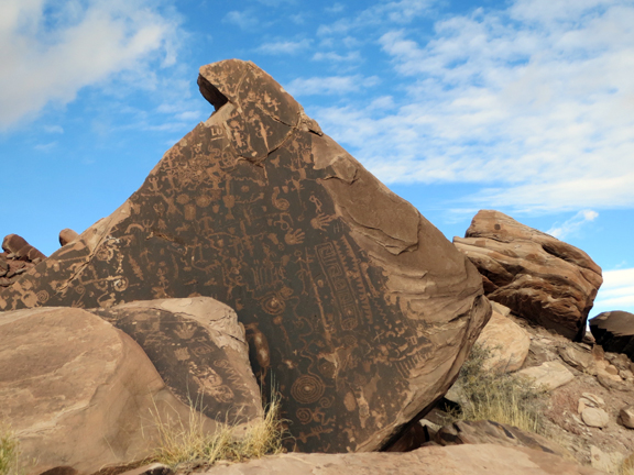 Day #27. This was the last day. I washed the casita laundry, Emily did most of the cleaning (bless her), and we went for one last hike to one of my favorite spots with beautiful views of the desert, many potsherds, and some excellent petroglyphs. The weaving came from one of the simplest potsherd designs.