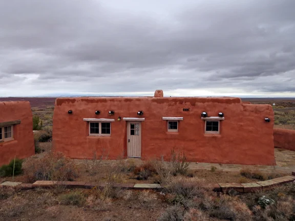Day #25. I drove to Flagstaff to pick up Emily this day. I stopped at La Posada in Winslow and sadly, did not eat there (it was a celiac disease thing--despite the vast difference in food quality, Chipotle is safer). I did see the artist-in-residence work from 2015 which was being shown. I wove a simplified image of the casita to remember the amazing little adobe where I stayed for a month.