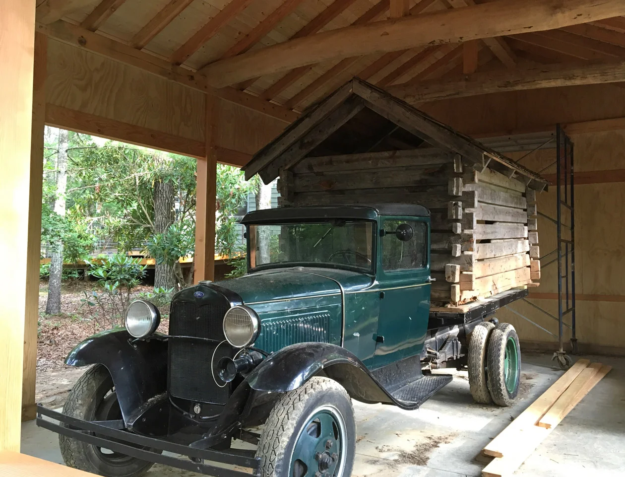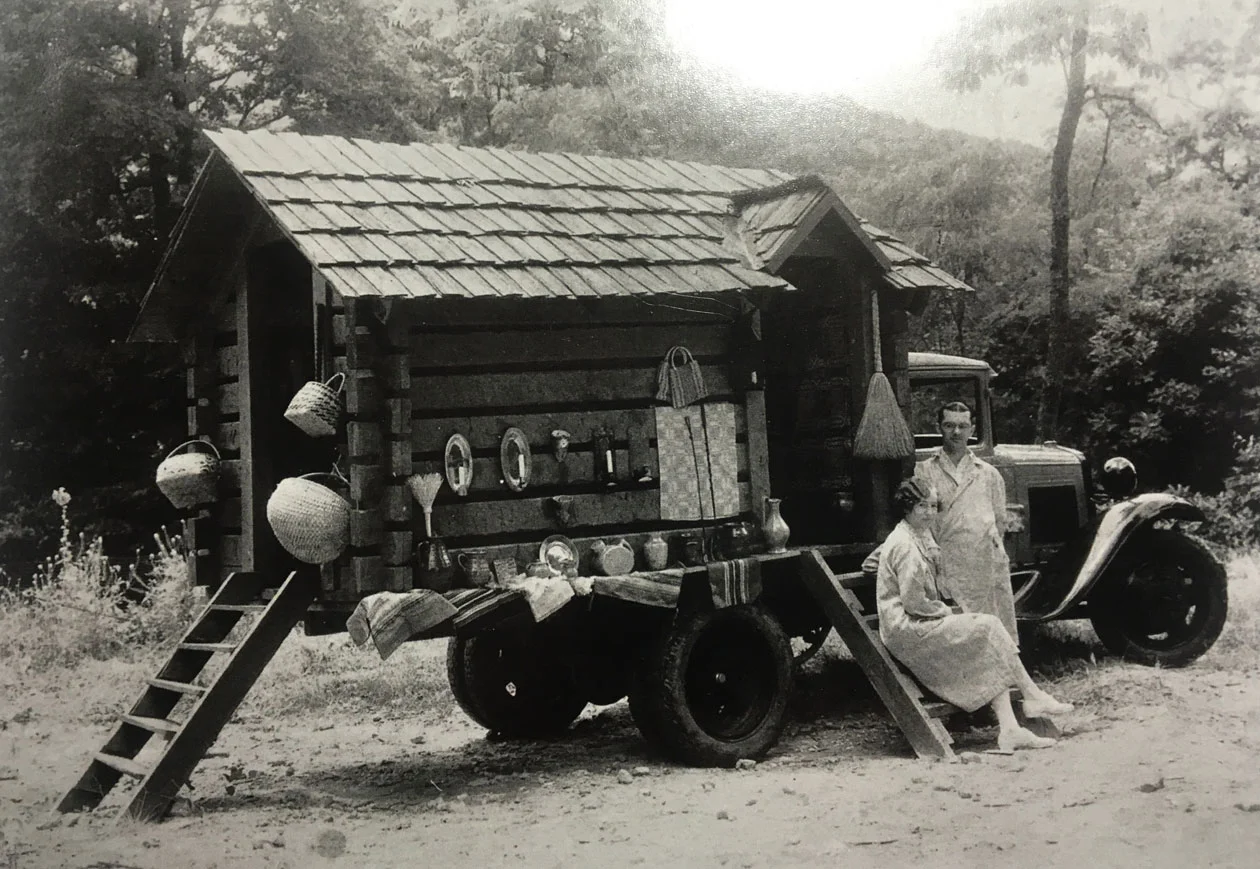Penland's current-day replica of Lucy Morgan's 1933 truck and "tiny house" for the Chicago World's Fair. Housed in a post and beam structure made by a class in 2016.