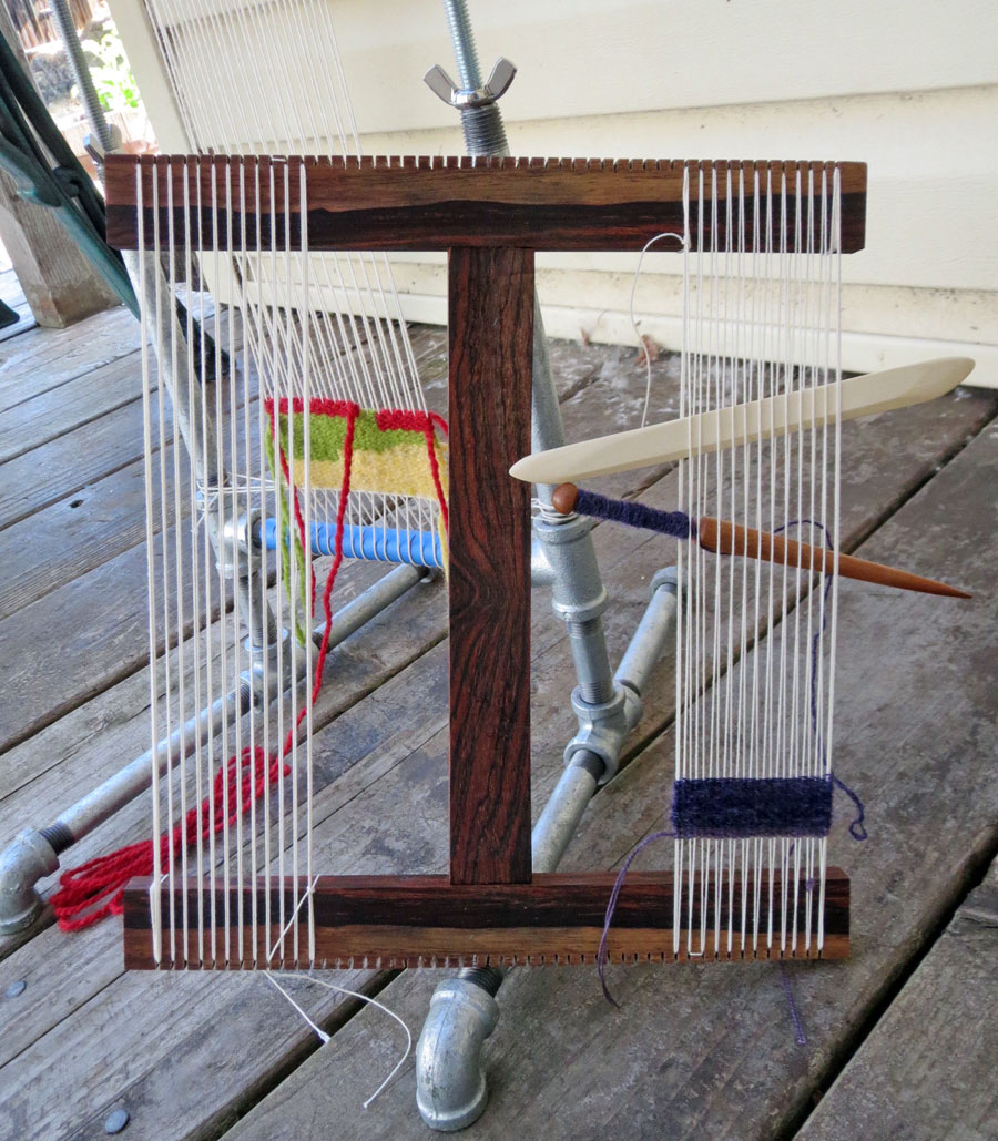 And so that leaves looms. I've never traveled to teach a workshop where I didn't bring a Mirrix loom, but Penland is different. They have tons of looms. If I get desperate, I can use one of theirs. I'm considering bringing this guy instead. It is the pipe loom I built a few months ago and have since found some longer pipes to make it wider. I want to work on more four-selvedge experiments and I won't have much time to weave anyway. I will be teaching after all!