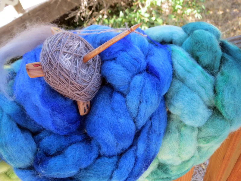 I start with the braid and quickly found a Frabjous Fibers Colorshift Top braid I bought a few months ago. Done. I couldn't possibly spin the whole thing on a drop spindle in two weeks. I think the Jenkins Lark spindle will like this braid as soon as she is finished with the current project.