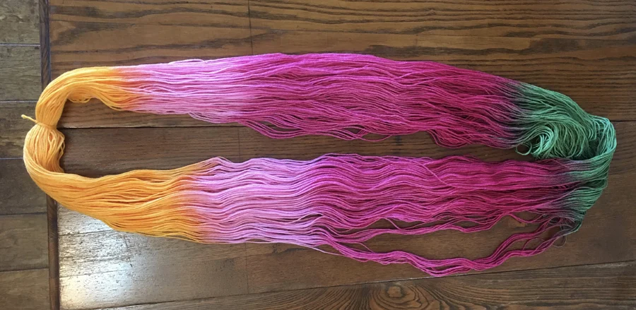 After you've located the yarn that has the tightest twist and the least bounce, look at how it is dyed. Obviously if it is a solid color, that is fine. But most sock yarns are dyed so that they create stripes or patterns when knit. Open the skein up and look at it. Most sock yarn is fingering weight. I used some lace-weight yarn in this project also. Yarns will be different thicknesses regardless of whether they are all labeled fingering or lace. If they come from different manufacturers, they will be different sizes and they will weave differently. All this means is that you'll weave more sequences with the thinner yarns.