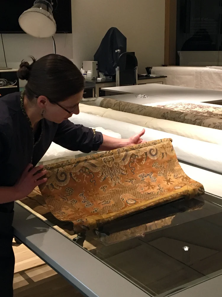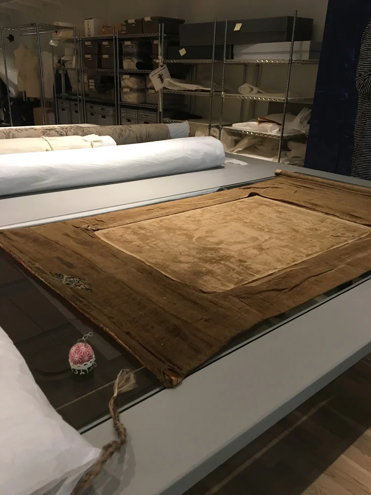 The images were taken from five continents. We spent time talking about how these wall coverings were usually tacked to the wall, how they were often repaired with patches from other fabrics, and how repairs are done by the museum to allow the textile to be safely hung.