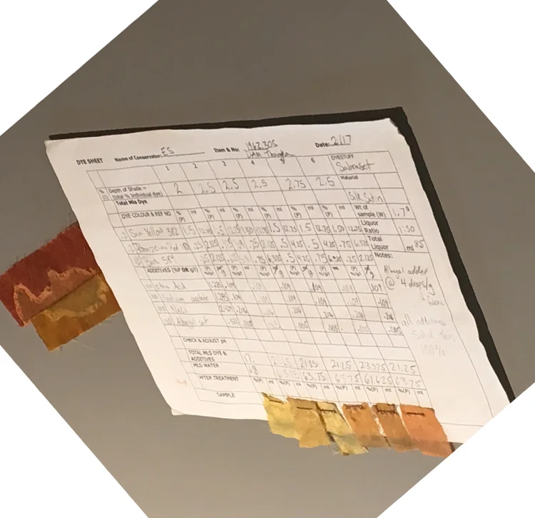 Emma described the lengthy process of dyeing silk to replace patches on the inside of the lining and I was thrilled to be able to enter a discussion of acid wool dyes. Emma and Allison talked about the washfast and lightfastness of Sabraset acid wool dyes and I was so happy to hear them reinforce what I have been saying all along. They are the best acid dyes for protein fibers available.