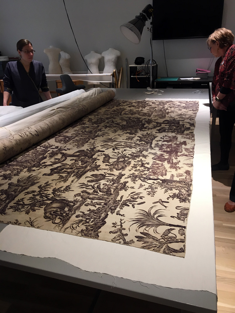 This time it was an 18th Century wall cotton covering. Somehow I didn't really have a concept that people used printed cloth to cover walls before they used paper. Of course it makes sense when you think about medieval tapestries being wall coverings and that moves logically to using fabric which is printed (and much less expensive). This textile had been wet cleaned which is somewhat unusual for them to do especially given the size of this piece. They build a special tank in the basement of the museum to do this.