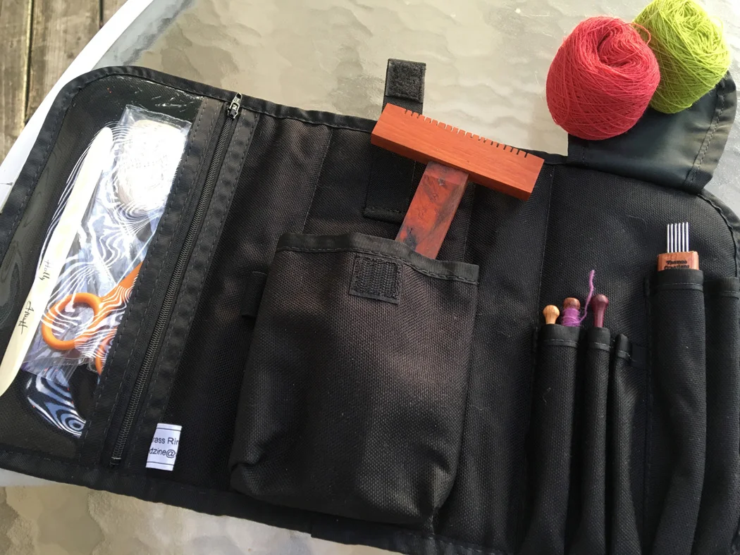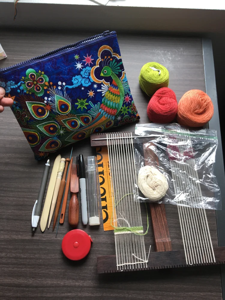 All of those tools including the loom fit inside a zippered Tyvek case. I've seen these kinds of simple bags often at knit shops or you could make something yourself. Tyvek is light and tough and us backpackers use it for ground cloths for this reason. It works well for weaving bags too.