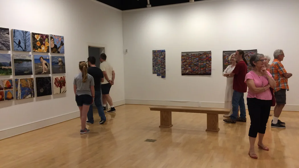 Janet Austin, Geri Forkner, and Tommye Scanlin enjoy the opening of the Time Warp show in front of Geri's work.