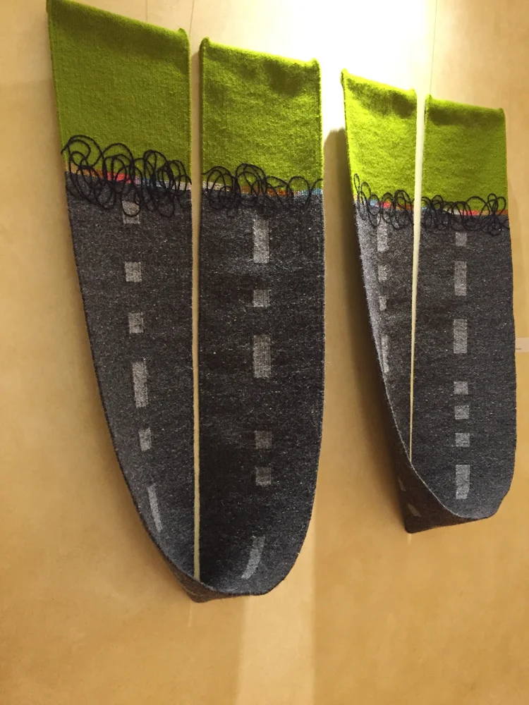 Joyce Utting Schutter, Kayak 1: Shore to Shore and Michelle Sirois-Silver, Imagined Dialogue 2 (handhooked)