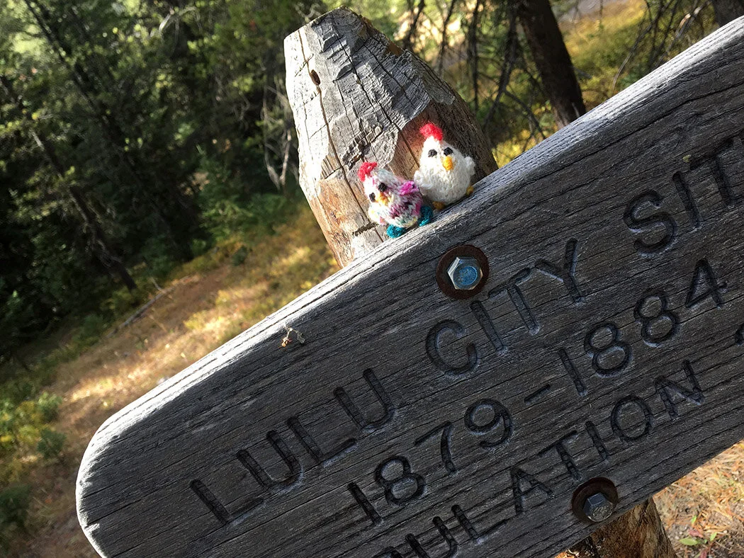 And these chickens were spotted at the LuLu City Site—an old mining town which is pretty much completely gone now. It was a gold rush town and existed from 1879-1884 before it faded away again. Only the chickens and this sign remain.
