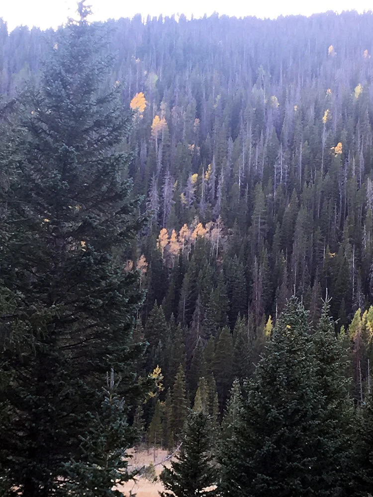 Aspens among the beetle-killed spruce and pine.