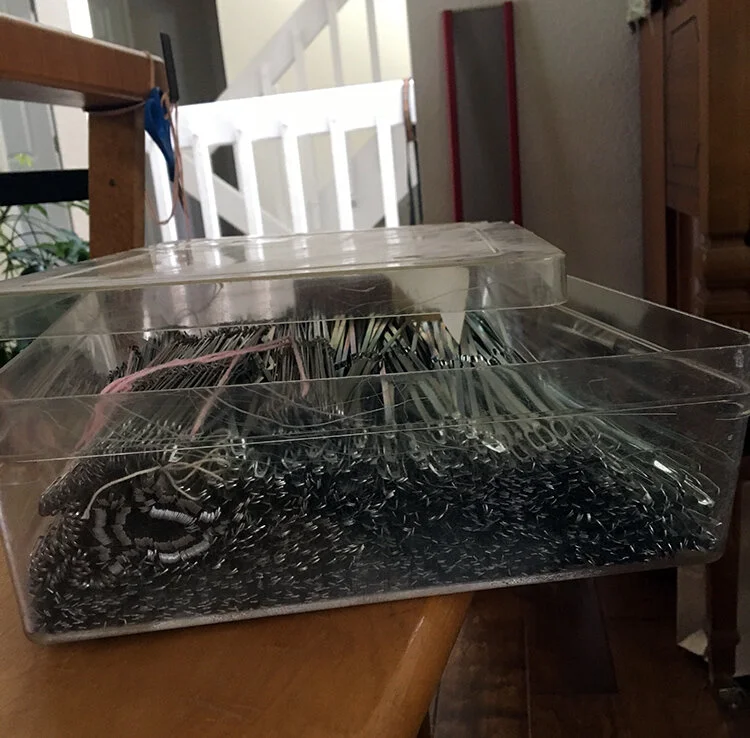 This loom is a 16-harness Mac but grandma only ever had 10 harnesses on it. I think this is clearly enough heddles to warp all 10 harnesses all the way across at a pretty high epi. Grandma was prepared when it came to her tools. She also labeled EVERYTHING like this. I wish I knew if these notes ever helped her later on or if it was just a habit to make the thing her own. At any rate, I’m grateful for the large stash of excellent heddles. (There is a piece of tape on the end of a treadle of my baby Mac, also grandma’s, which says, “dog chewed”. The tape is covering the mangled end of the treadle. I can’t bear to take it off.)