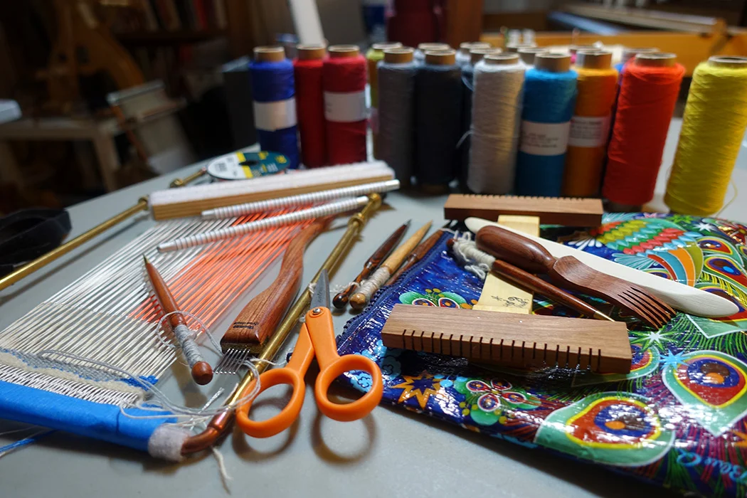 The Hokett loom is very small, only requires a couple tapestry bobbins, a shed stick, and a tiny tapestry fork, and weighs almost nothing. Seems like a good choice. But then there is the Fringeless loom.