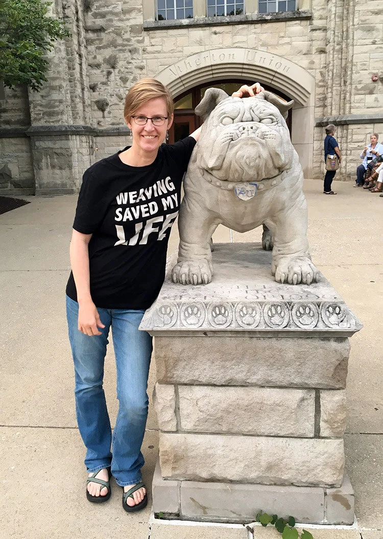 “Weaving Saved My Life” t-shirt, photo from Midwest Weavers Conference which was held at Butler University in 2017.