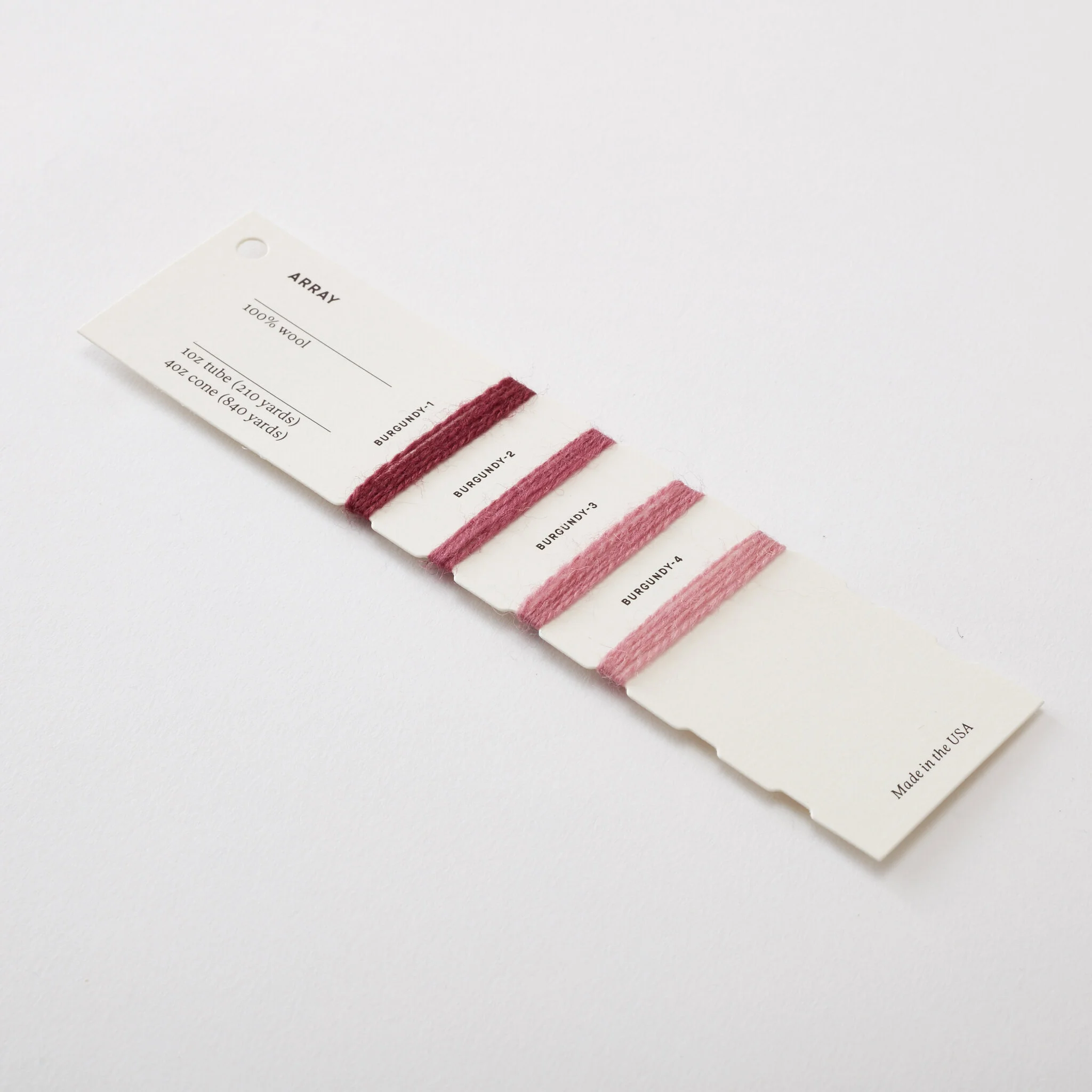 If you’re a tapestry weaver, you know that there aren’t all that many yarns that come in a wide range of colors that include gradations. This holy grail of tapestry coloring, having light, medium, and dark versions of the same hue, only exists in a few yarn lines and none of them currently are made in the USA. Gist Yarn has tackled this challenge with a beautiful yarn they have aptly named Array. The line is launching with around 70 colors and plans to expand as the yarn sells. Each hue comes with light to dark gradations of four or five shades.