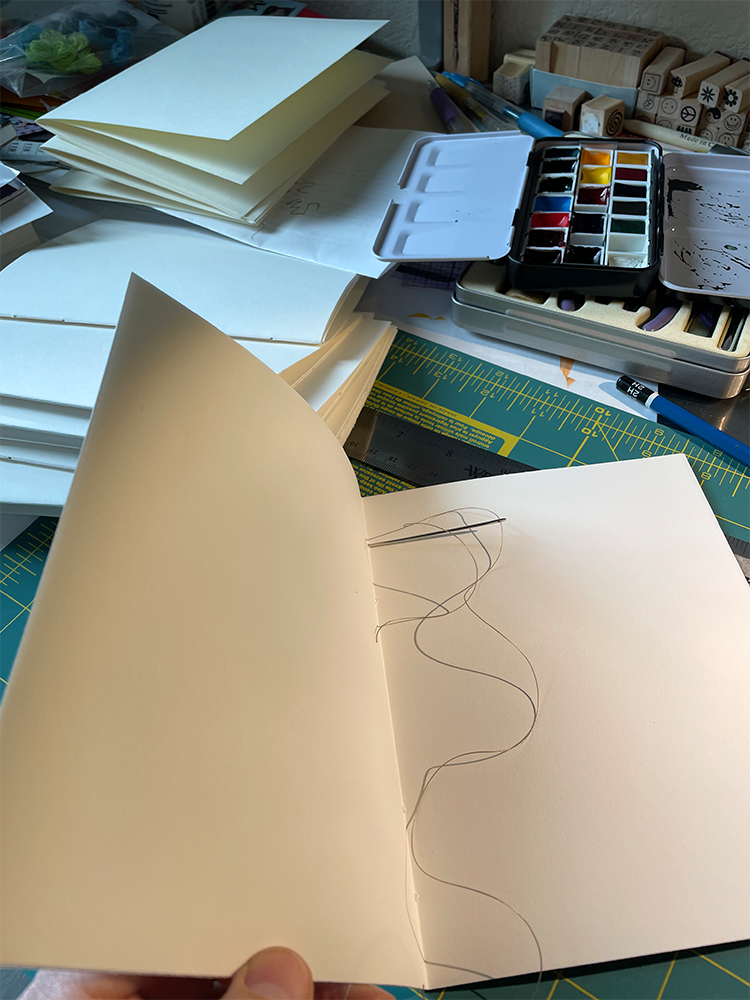 I am a big journaler but I don’t want to carry a full sketchbook with me. I decided to learn enough about bookbinding to make a book when I get done with the trail. I temporarily stitched some signatures which I will have in my resupply boxes and I will do a Coptic binding when I get off trail of the whole book. Some of the pages are watercolor paper, some are nice journaling paper that will take drawing pens as well.