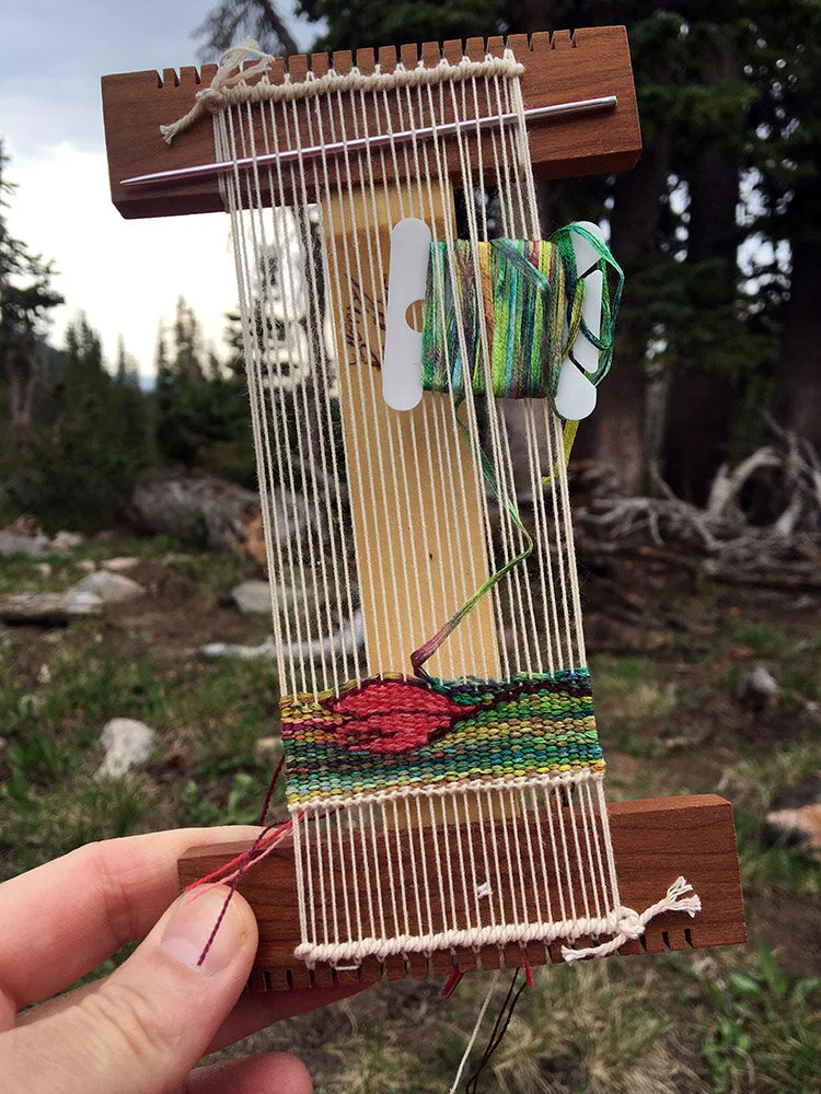 And of course I almost always bring a tiny loom while backpacking. This tiny Hokett loom has been my main backpacking loom for years now. It is made of very lightweight wood and so far I have managed not to break any teeth off of it. I don’t usually weave on looms this small because the shed is so short it is difficult to make anything very large without a struggle. So I usually make things just 2-3 inches long which suits my trail life just fine. It is a 6 dent loom and I warp it for 12 epi which works with my handspun.