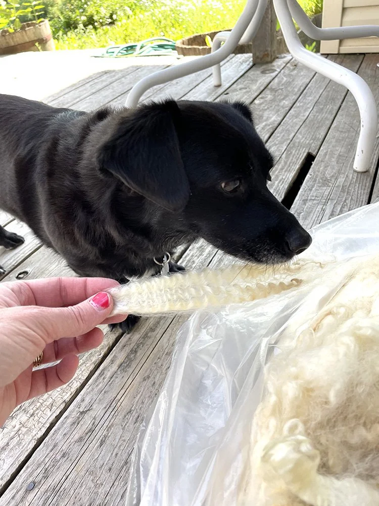 This Lincoln fleece definitely smells good to a dog! That fleece is for me and is destined for the combs and tapestry yarn.