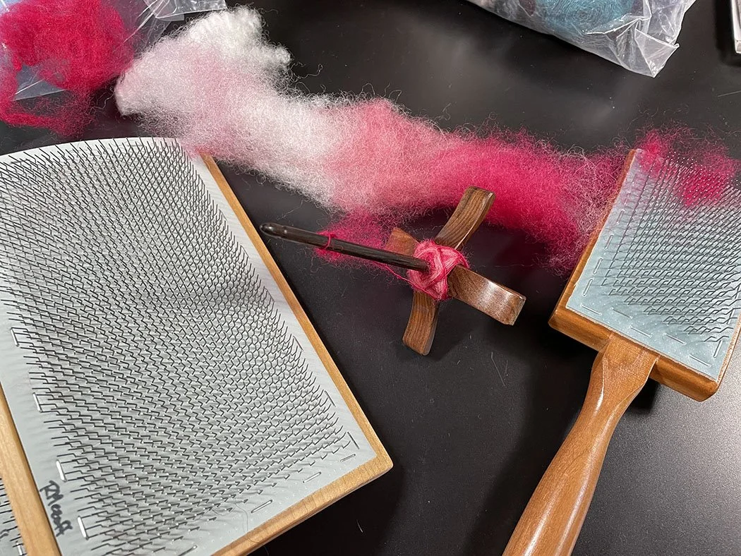 I had two tapestry ideas. One of them I’ve decided to use as an example in the Summer of Tapestry workshop coming up in July, but the other I’ll show you here. For this second tapestry, I wanted to weave the colors of those rose bushes without any attempt at depicting their forms. I chose a tactic I love to use, spindle spinning locks of colored fleece to make a yarn that changes color as I weave it. I had fleece in two different pinks, white, and two different greens and that resulted in a little ball of yarn that was just perfect for my roses.