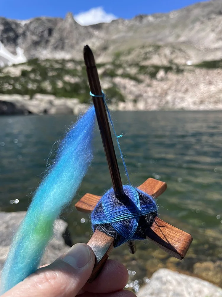 I didn’t bring my loom on that short trip, but this spindle had quite a whirl. We sat at this lovely lake for many hours and I did a bit of spinning, basking in the sun, and watching various dogs and people braver than I swim in this ice-melt water.