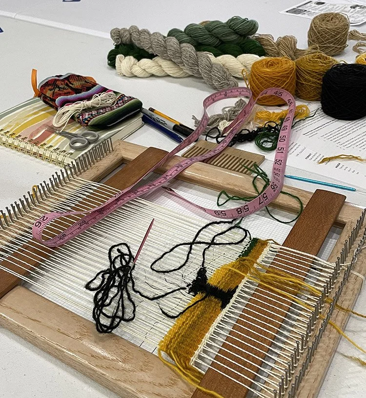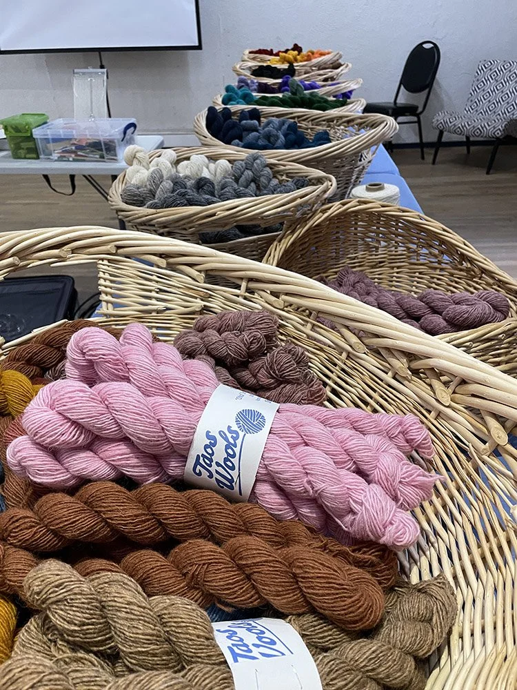 A huge selection of Taos Wools chica churro yarns ready for the workshop.