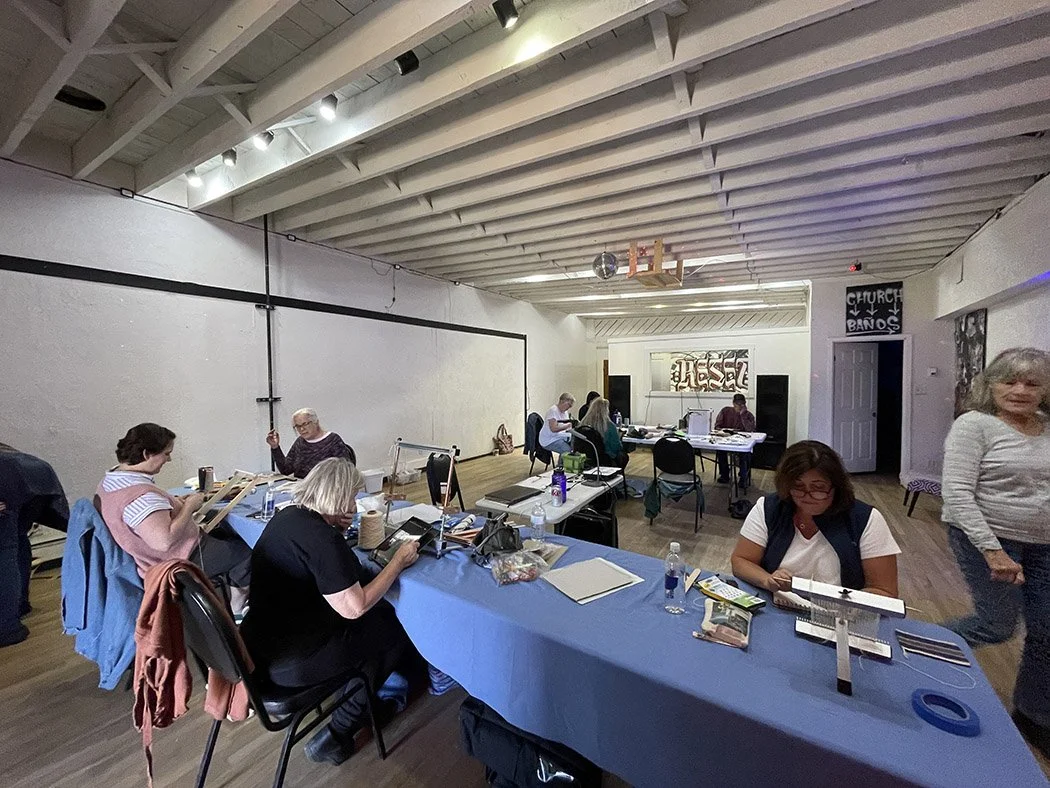 The class warmed up quickly, decided on their designs, and started weaving. We were working in a community room owned by Revolt Gallery. We didn’t fire up the disco ball, but perhaps we should have!