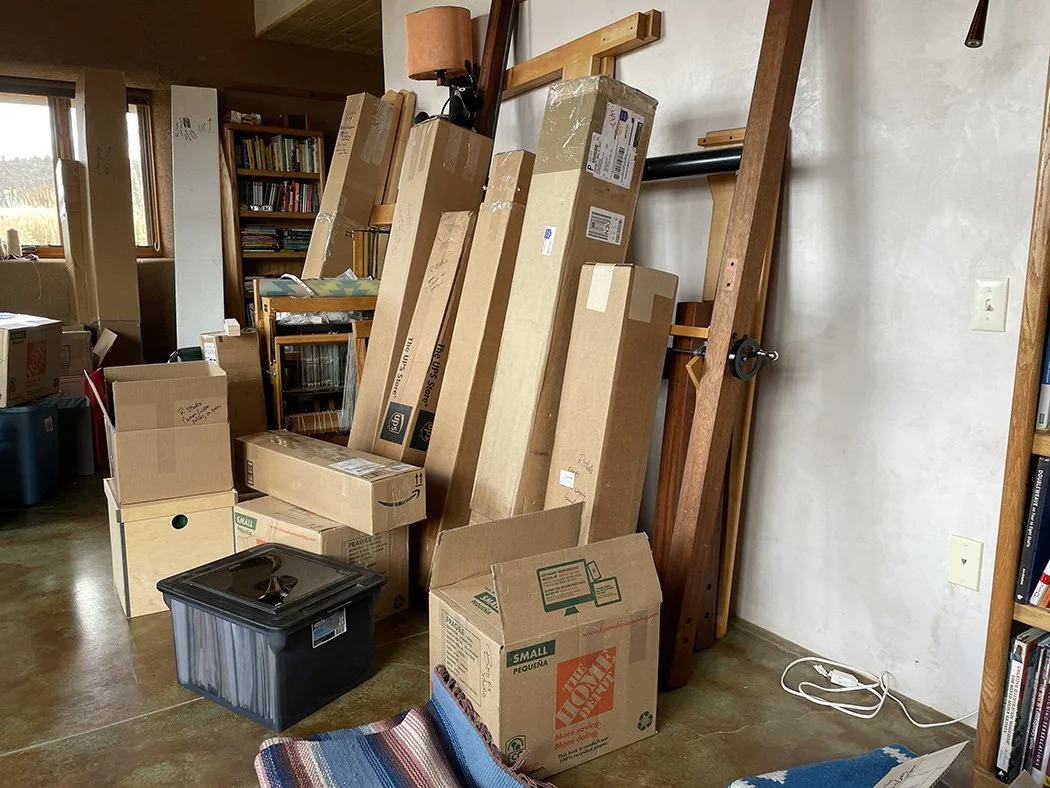 Many many long boxes containing loom parts and other studio equipment. The boxes were mostly marked but there were a few pieces I had to go hunting for.