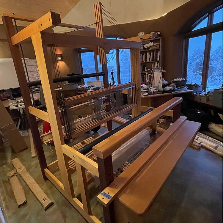 Rebecca and the loom going back together in the new studio.