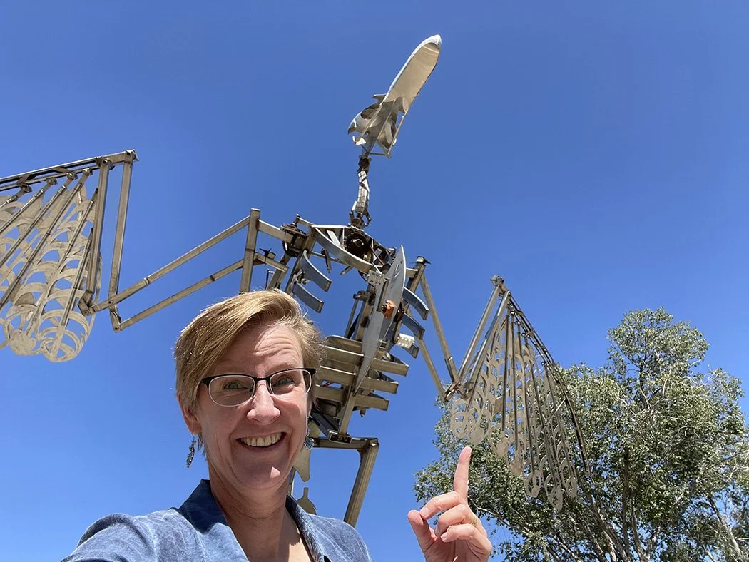 I know I posted a very similar photo of me and this statue last year when I taught for Taos Wools Festival, but this year there were chickens running around under it! I laughed and laughed. I couldn’t get a photo of the tiny chickens and the giant statue, but it was funny… perhaps only to me. The artwork is Fledgling by Christian Ristow.
