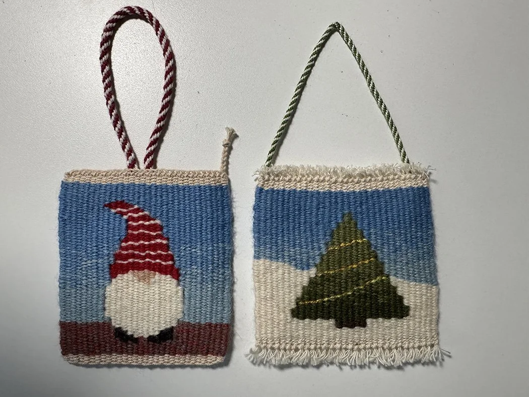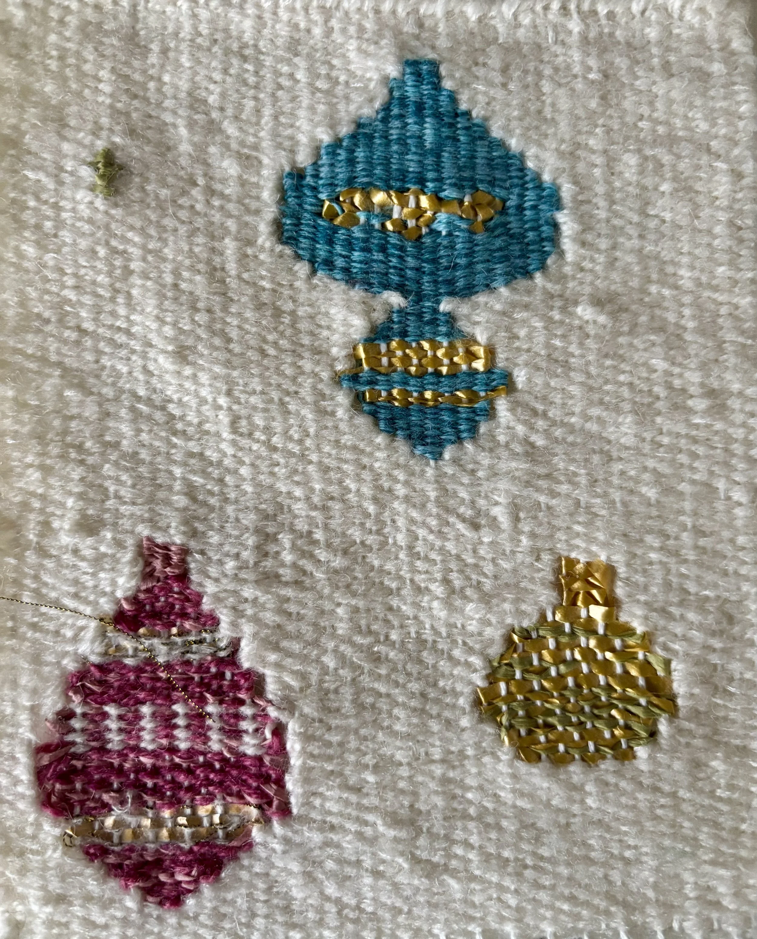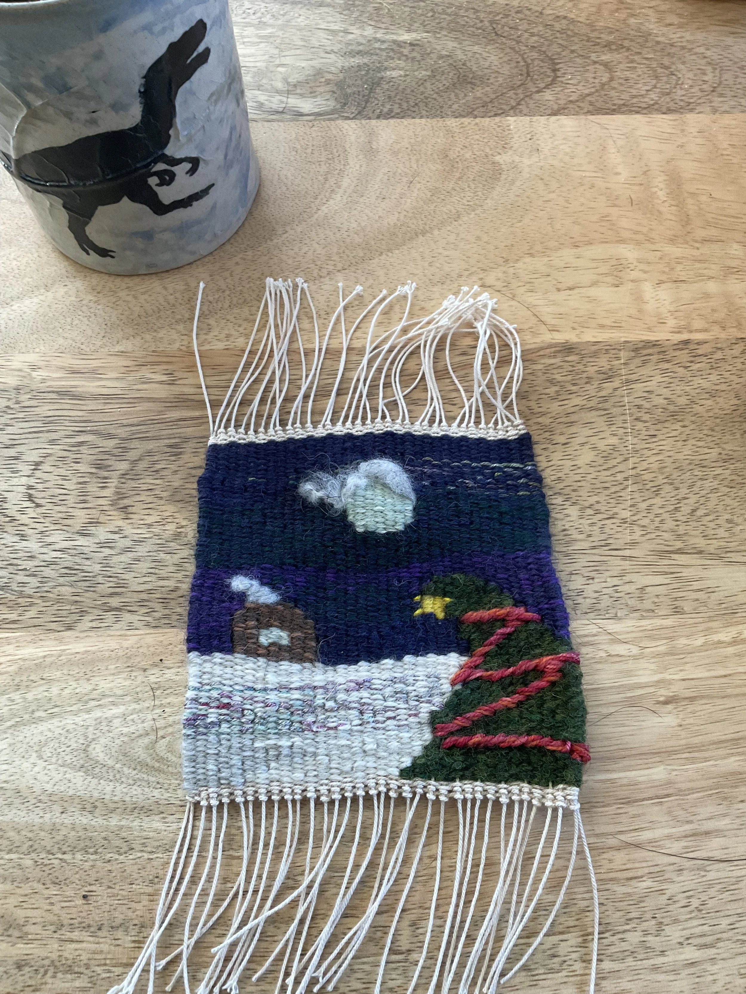 In the episode on the 27th I started a new tapestry and we talked some about choosing yarn colors, especially as it comes to value. During the broadcast I wove perhaps 3/4 of an inch in a design woven on its side. I had just gotten to a non-tree element, a holiday ball ornament that I felt compelled to weave and the live participants helped me choose which hand-dyed silk strands to use for the colors.