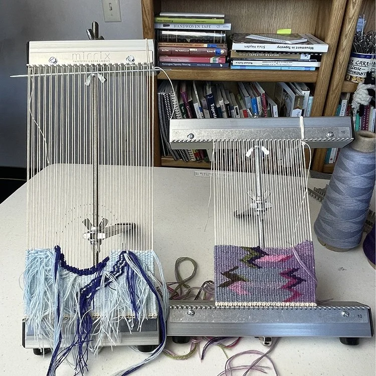 Five and eight inch Chloe looms with the long and the short rods, both with stands installed. The tapestry on the left is being woven from the back and was a demo of double weft interlock for a design workshop. The tapestry on the right is a sample I’m working on for the next Tapestry Discovery Box.