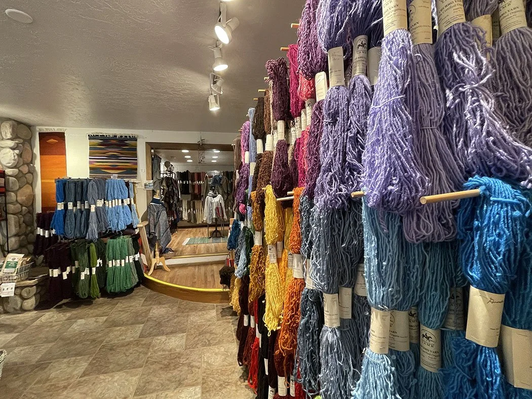 When you walk into the shop, this is what you see. Shepherd’s Lamb, the Manzanares’ farm, raises Churro and Rambouillet sheep and they mill and dye the yarn and sell it for tapestry weaving. The color selection is huge and so beautiful to see on the wall.