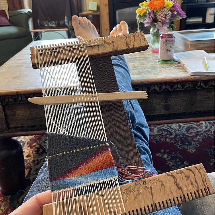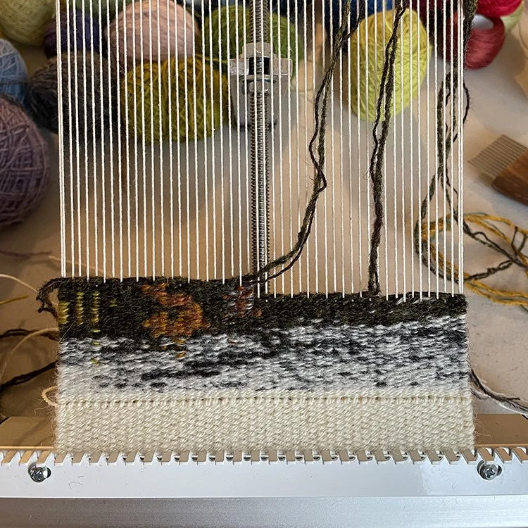 Weaving in the Good Commons living room during the Vermont tapestry retreat. Because someone will ask, this is a Handywoman Shop 6-dent loom warped at 12 epi, weaversbazaar fine wool, and a Stephen Willette shed stick. There are resources under FAQ on my website for many of the tools and materials I like to use.