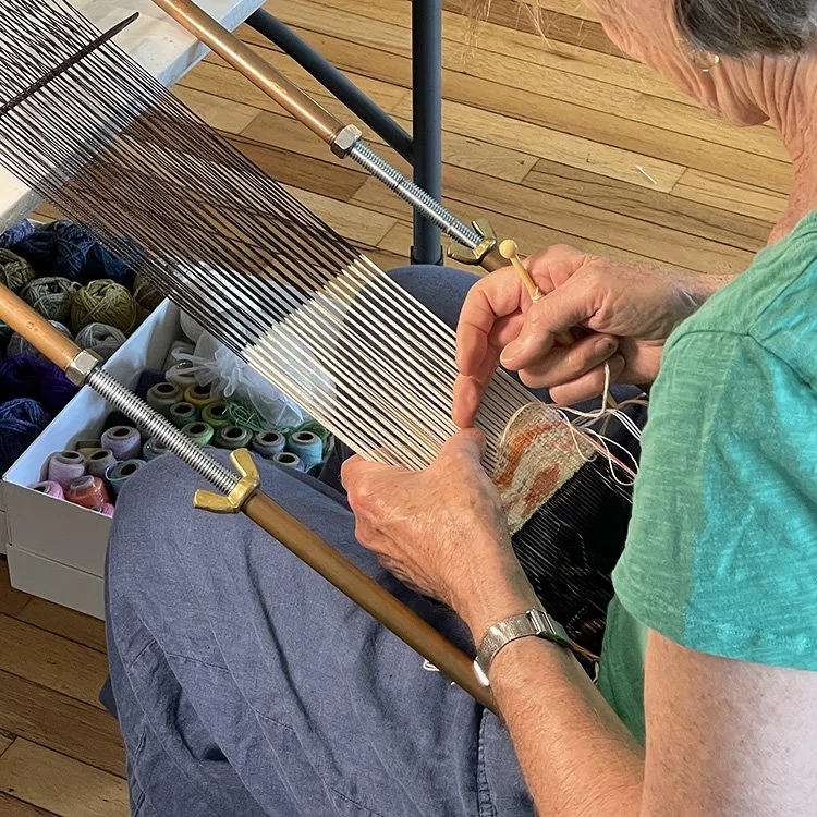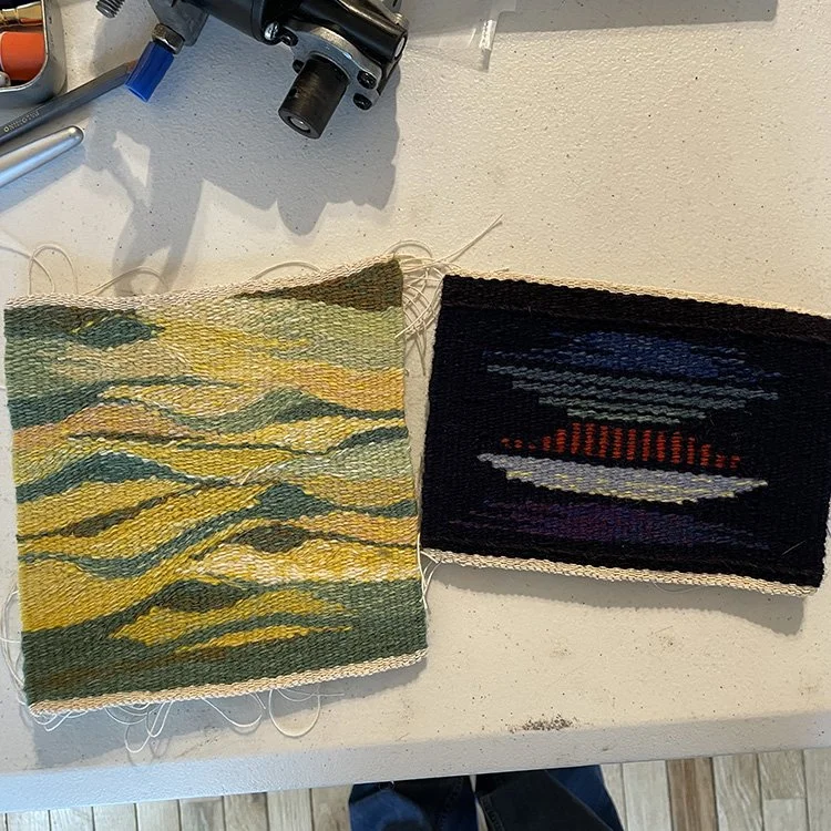 Jane and Mary working through samples for larger tapestries they will weave at home.