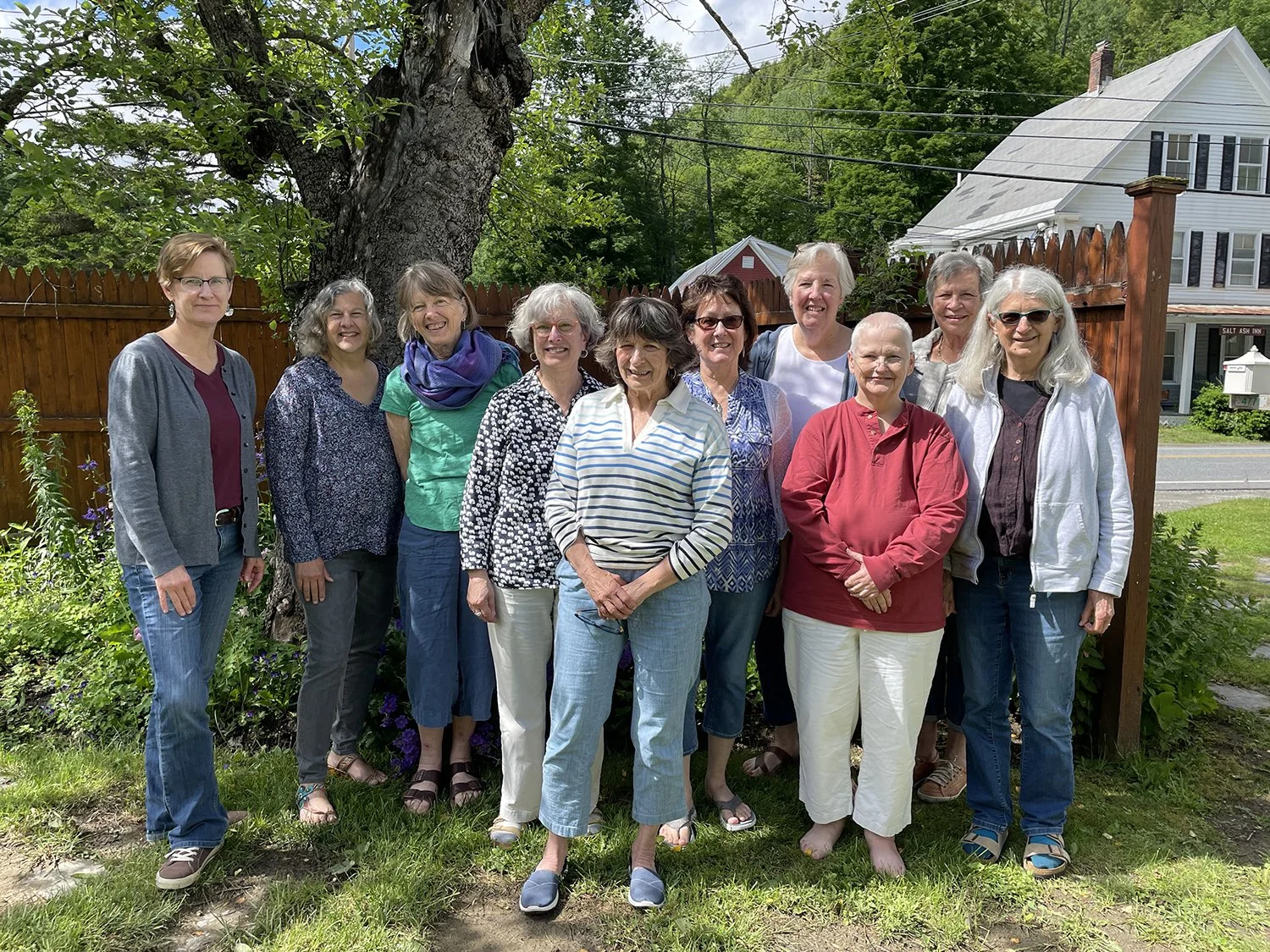 The Vermont 2024 tapestry retreat group left to right: Rebecca, Elaine, Gwen, Esther, Carol, Karen, Mary, Pat, Jane, and Leslie.