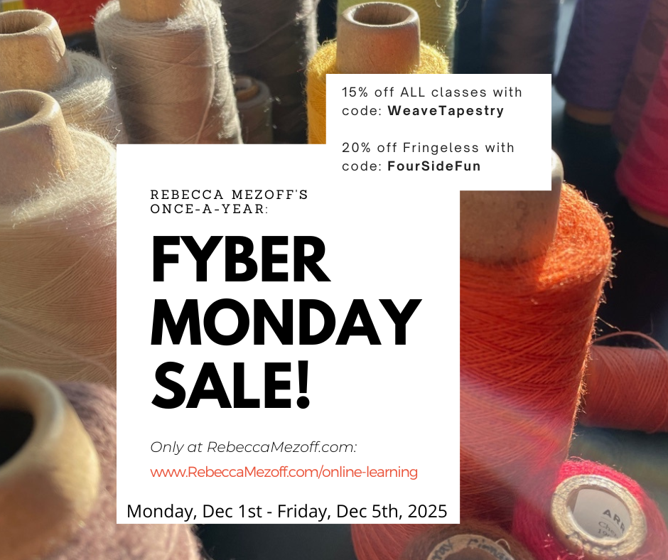 *The sale does not apply to the Tapestry Discovery Box that I sell through Gist Yarn. However, they do have two of the Tapestry Discovery Boxes available as stand-alone classes. The Curves, Circles, Hills and Valleys box and the Wedge Weave box are discounted today and you can find them on Gist’s website HERE. Note that their sale is for 10% off and it ends today. No code is needed, the discount is applied already. They also have the Introduction to Tapestry Weaving kit and the Introduction to Rug Weaving kit on sale.