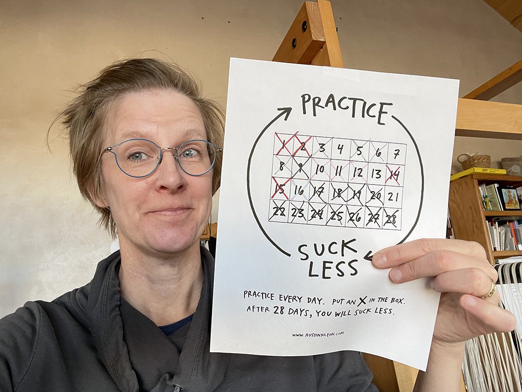 As Kleon’s poster says, you just practice every day and when you do, you put an X in the box. No rules about how long you have to practice or what practice even means. Just do it.