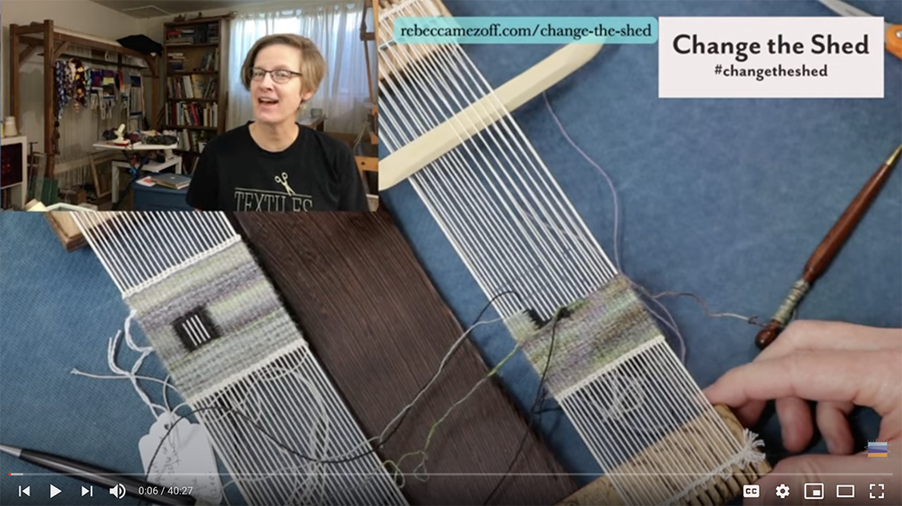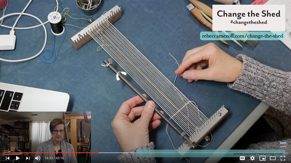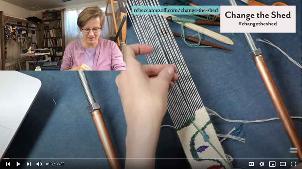 Wednesday, April 22, 2020 is HERE. This is the one day I set up my greenscreen for a different backdrop. I worked on the Hot Flash Tapestry with two setts: 8 and 16 epi. I demonstrated sewing a slit. Showed some of the challenges of weaving at two setts on one piece especially where they meet each other. I also talked about the tines per inch in a tapestry beater.