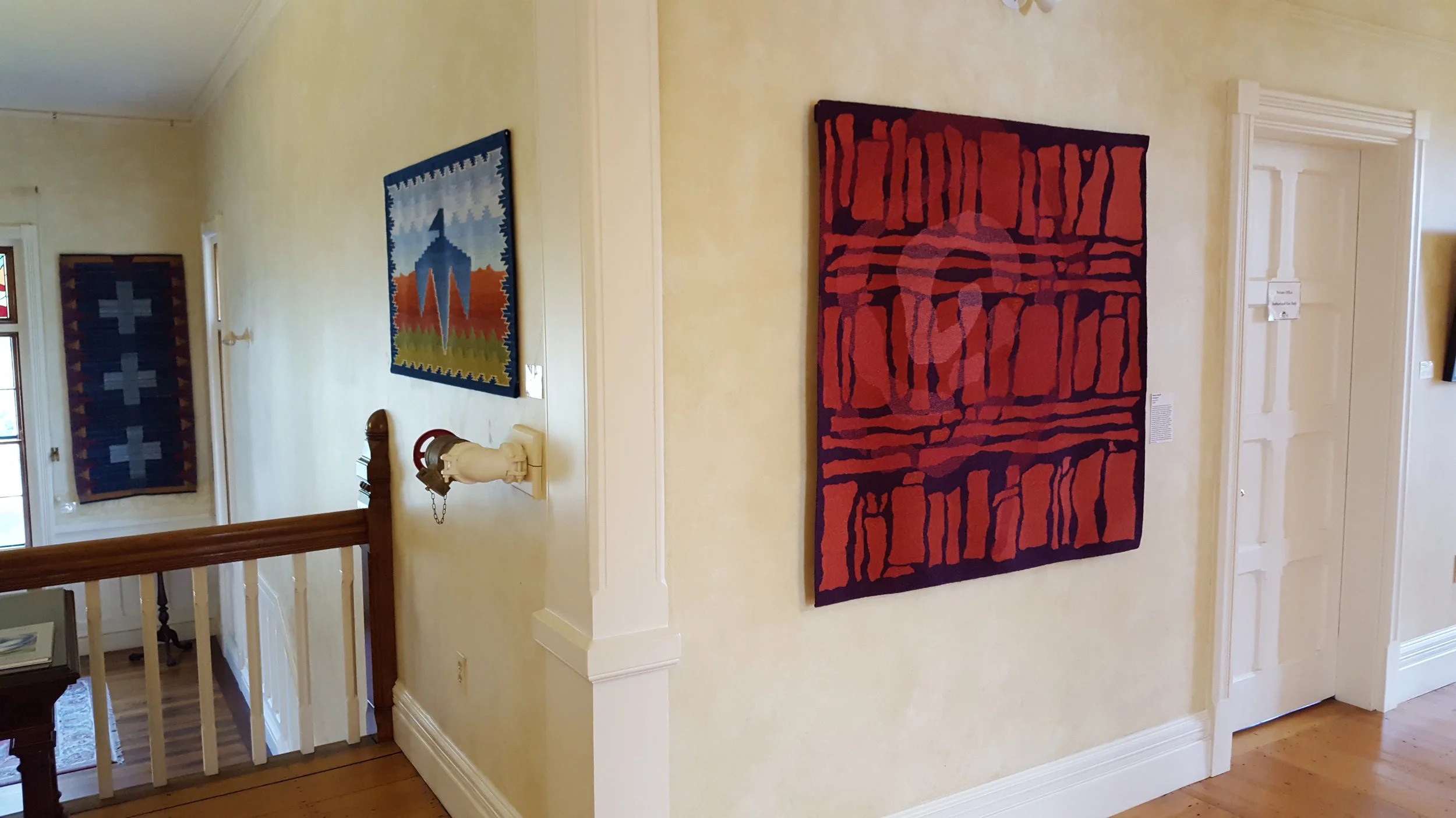 Tapestry to the right is Emergence I by Rebecca Mezoff. Tapestry in the center is by Sarah Warren. Left by Sarah Hotchkiss.