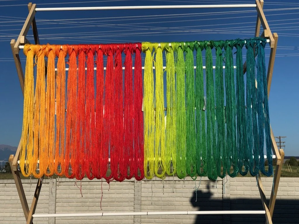The images in the gallery below give you some of a feel for my dye process, various dye “studios”. I’ve worked in, and some finished yarn. Right now I dye yarn in my garage. I’ve dyed yarn on back patios, in car ports, on a patch of patio outside my back door, and in state-of-the art dye “kitchens” which unfortunately weren’t mine! I don’t recommend dyeing yarn in your kitchen as it isn’t the safest dye set up for acid wool dyes. I talk about alternative places to dye yarn in the course.