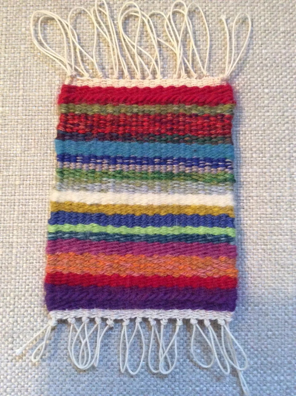 I’ve just completed my first Hokett tapestry project and as a Senior I am thrilled to have this sight and your wonderful expertise on all of this. Rebecca you are wonderful and such a fabulous teacher. I know this takes a lot of work and energy to do all that you do and I thank you from the bottom to the top of my heart. I love it and have just begun my journey. Here is my first project on the first sample of the hem with the twining and soumak and of course it’s not off the bitty loom yet but looking forward to so much more. ”