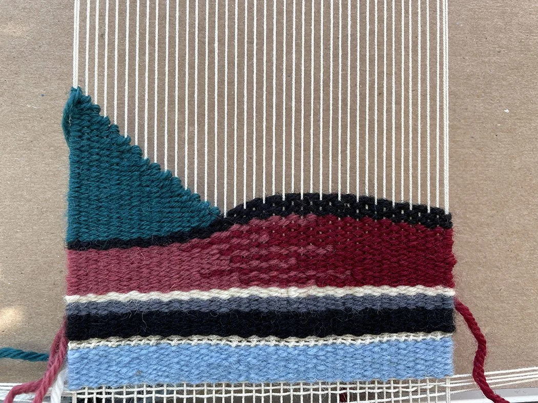 The class includes things you might experience with yarns that in my opinion don’t work for tapestry weaving. For example the image below is woven with Knit Picks Wool of the Andes. This is an inexpensive yarn that comes in a lot of colors, but it is very soft for tapestry weaving. It packs and packs and packs and is very difficult to manage in the shed. It is far from an ideal tapestry yarn and if you’re struggling with a yarn like this as a beginner, it is the material, not you.
